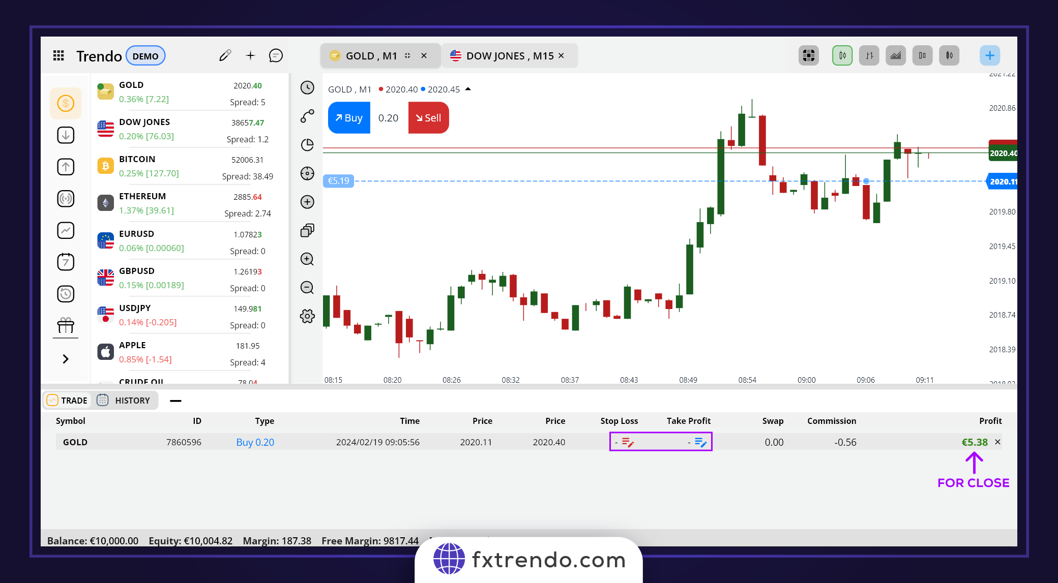 لتعيين جني الأرباح و إيقاف الخسارة، بعد فتح الصفقة، ضع مؤشر الماوس في المنطقة الأرجوانية المشار إليها في الصورة أدناه و انقر عليها.