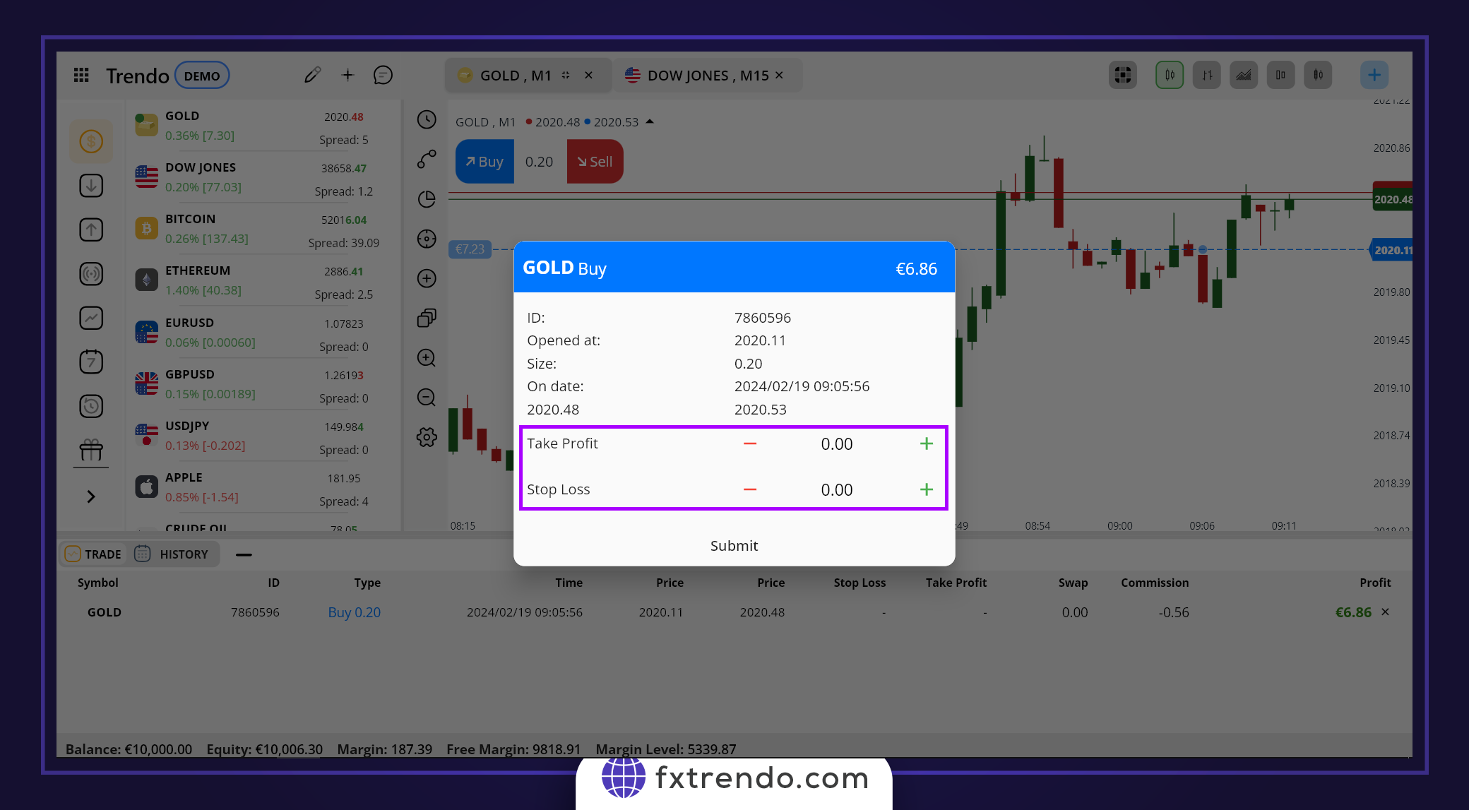 بعد النقر في المنطقة المحددة، المشابهة للصورة أدناه، في نافذة جديدة، قم بتعيين أمر حد الربح و إيقاف الخسارة في المربع المحدد (بنفسجي) و انقر علی submit.