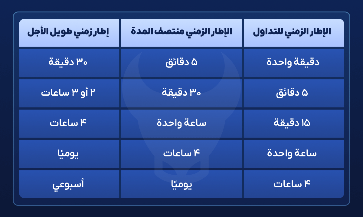 الصورة أدناه توضح كيفية تقسيم الأطر الزمنية للتداول على ثلاث فترات. في هذا الجدول، يتم حساب الإطار الزمني متوسط المدى بـ ٤ إلى ٧ أضعاف الإطار الزمني للتداول، و يتم حساب الإطار الزمني طويل الأجل بـ ٤ إلى ٧ أضعاف الإطار الزمني متوسط المدى. يمكنك تحسين هذه الأوقات وفقًا لاستراتيجيتك و تناسب أسلوب التداول الخاص بك.