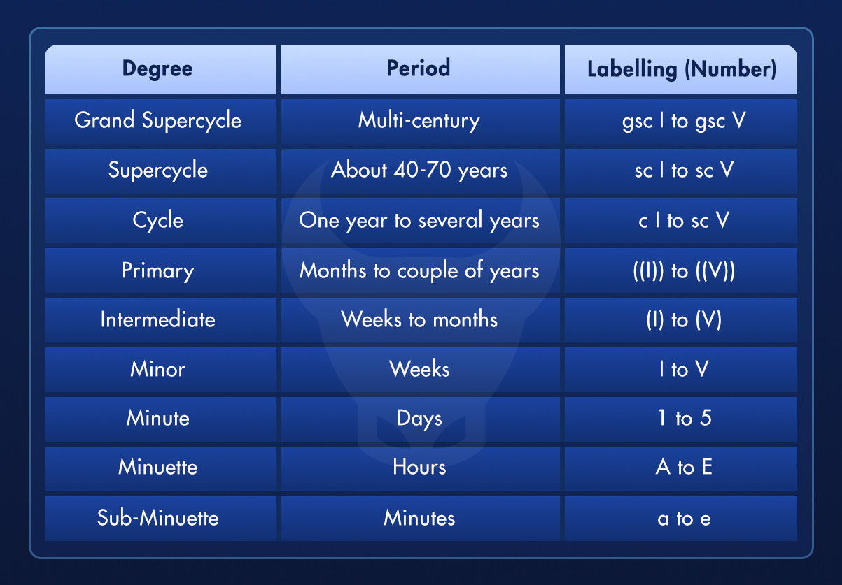 وفقا لوجهة النظر النهج الکسری أو الفراكتلية، يمكن تقسيم أي موجة إلى موجات أصغر. لكن تسمية هذه الموجات تصبح جزءًا صعبًا و لذلك، لتبسيط تسمية هذه الموجات ، قام إليوت بتعيين سلسلة من فئات الموجات من حيث الحجم (من الأكبر إلى الأصغر).