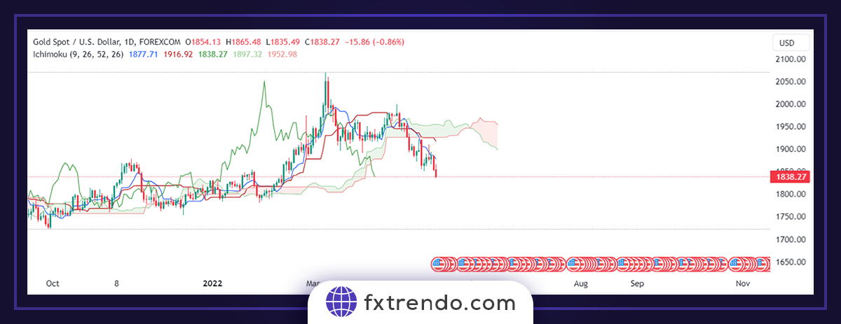 في الشكل أدناه، يمكنك رؤية الرسم البياني للذهب، والذي يحتوي على جميع شروط استراتيجية ايشيموكو K-cross. حتى نتمكن من الدخول في صفقة البيع.