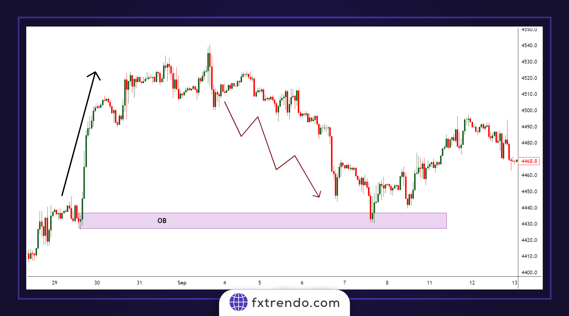 فواصل الهيكل (BOS): BOS هي إشارة السوق الأولى لحركة السعر في اتجاه معين. في الاتجاه الصعودي، يحدث كسر في الهيكل عندما يرتفع السعر و یرفض آخر ارتفاع مسجل و في الاتجاه الهبوطي، يحدث عندما ينخفض السعر و یرفض آخر مستوى منخفض مسجل .یمكنك رؤية ما ذكرناه في الصورة أدناه.