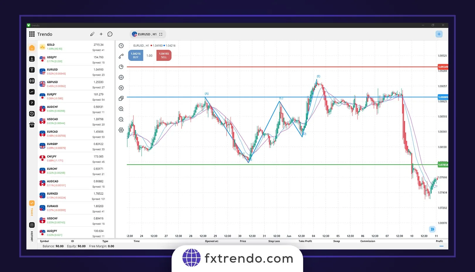 ورود به معامله در این الگو در نقطۀ D انجام میشود. علاوه بر این، همواره حد ضرر را در معاملۀ خرید، پایینتر و در معاملۀ فروش بالاتر از نقطۀ D قرار دهید. این ناحیه به این دلیل انتخاب شده است که اگر قیمت از این نقطه عبور کند، الگو باطل میشود. این الگو چهار هدف کسب سود را ارائه میکند. این نقاط، X، B، C و A هستند. برای مثال، در تصویر زیر، شاهد یک الگوی پروانه نزولی هستیم و پس از رسیدن قیمت به نقطۀ D، شما میتوانستید با بستهشدن کندل تأیید، وارد معاملۀ فروش شوید. در این مثال، حد ضرر را کمی بالاتر از نقطۀ D قرار میدهیم.
