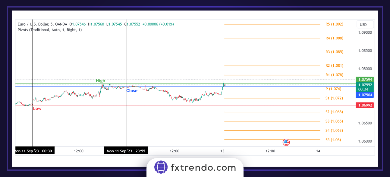 در این مثال قصد داریم سطوح مربوط به پیوت مرسوم (Traditional) را در تایم‌فریم ۵ دقیقه از جفت‌ارز EURUSD را در تاریخ ۱۲ سپتامبر ۲۰۲۳ محاسبه می‌کنیم. ابتدا کندل معیار را طبق الگوریتمی که در بخش قبلی توضیح داده‌شد، تعیین می‌کنیم. کندل معیار برای تایم‌فریم ۵ دقیقه، کندل روزانه است؛ بنابراین، قیمت‌های بالاترین، پایین‌ترین و بسته‌شدن را برای روز قبل، یعنی ۱۱ سپتامبر ۲۰۲۳ به دست می‌آوریم: