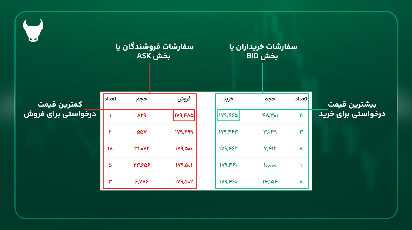 همچنین بدیهی است که در بخش Ask، کمترین قیمت فروش، در بالاترین اولویت قرار دارد و هر چه پایینتر بیاییم قیمت افزایش پیدا میکند؛ اما در بخش Bid بالاترین اولویت برای بیشترین قیمتِ خرید است و هر چه پایینتر بیاییم، قیمت کاهش پیدا میکند.