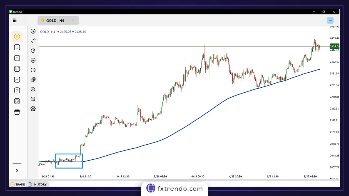 در کاربرد اول، یعنی شناسایی روند بازار، برای مثال اگر قیمت بالای میانگین متحرک ۲۰۰ بود، معاملهگران روند را صعودی در نظر میگیرند و اگر قیمت زیر خطِ اندیکاتور بود، روند را نزولی در نظر میگیرند و بهدنبال معاملات فروش یا Sell هستند. برای این حالت، معمولاً از میانگین متحرک با دورههای ۲۰۰ یا ۱۰۰ استفاده میکنند. برای مثال در تصویر زیر، زمانی که قیمت از SMA-200 به سمت بالا حرکت میکنند، معاملهگران روند را صعود در نظر میگیرند و تنها بهدنبال معاملات خرید هستند.