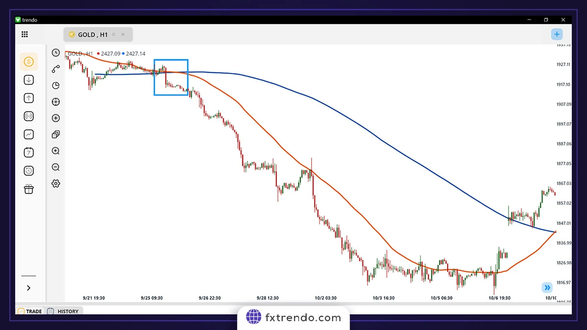 در کاربرد دوم، یعنی بررسی تقاطع یا کراسها، برای مثال اگر SMA-50 از SMA-200 به سمت بالا حرکت کند و آن را قطع کند، معاملهگران این را نشانهای برای روند صعودی در نظر میگیرند و وارد معاملۀ خرید میشوند. برای روند نزولی نیز عکس این حالت در نظر گرفته میشود. برای مثال همانطور که در تصویر زیر مشاهده میکنید، با کراس نزولی SMA-50 و SMA-200، شما میتوانستید وارد معاملۀ فروش شوید و سود خوبی از نماد طلا کسب کنید.