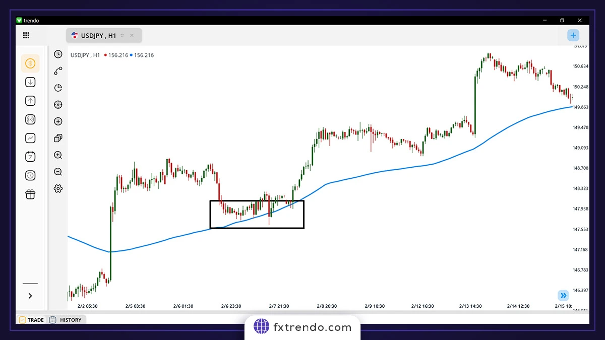 در کاربرد سوم، یعنی سطوح حمایت و مقاومت داینامیک، معاملهگران از اندیکاتور مووینگ اوریج بهعنوان یک سطح حمایتی یا مقاومتی داینامیک استفاده میکنند و با برخورد قیمت به آن، وارد معامله در جهت برگشت قیمت میشوند. برای مثال همانطور که در تصویر زیر مشاهده میکنید، قیمت پس از واکنش برگشتی به EMA-100 یا اندیکاتور مووینگ اوریج نمایی در نماد USDJPY، حرکت صعودی قابل توجهی را آغاز کرده است.