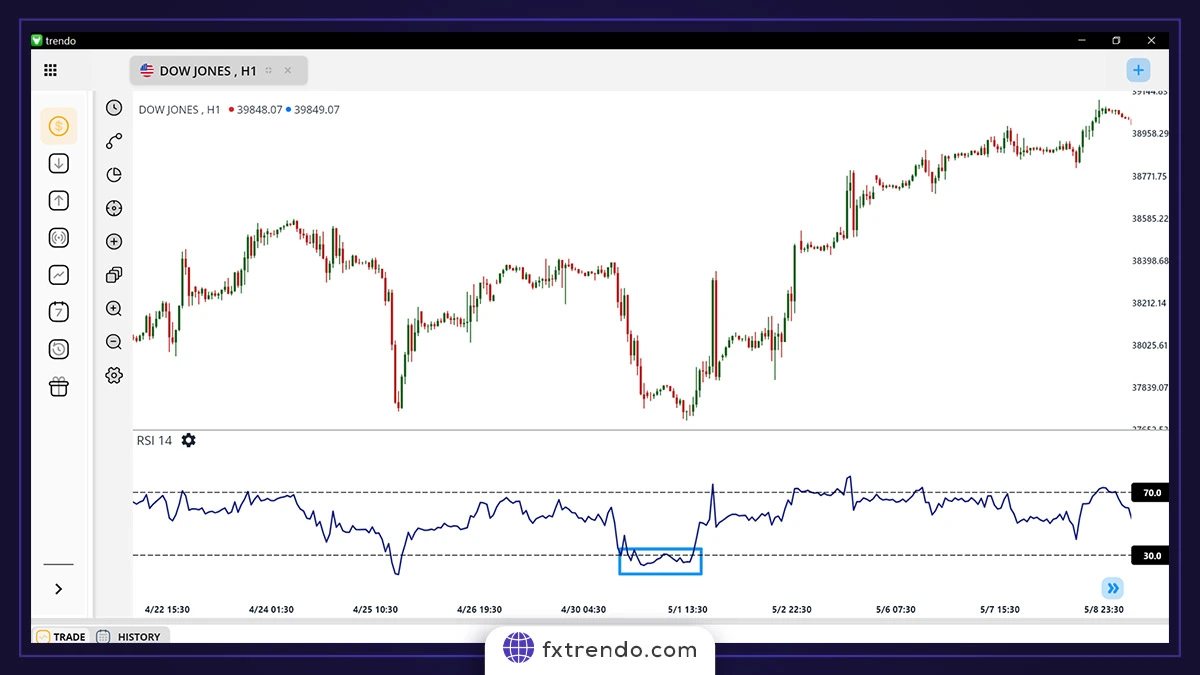 اندیکاتور شاخص قدرت نسبی (RSI)، یک ابزار برای بررسی مومنتوم است که سرعت و تغییر جهت قیمت را اندازهگیری میکند. RSI همواره بین محدودۀ ۰ تا ۱۰۰ در نوسان است و دیدگاهی در مورد اینکه آیا یک جفتارز در محدوۀ اشباع خرید است یا اشباع فروش است، به معاملهگران ارائه میدهد. RSI که توسط J. Welles Wilder توسعه داده شده است، یک اندیکاتور پرکاربرد در معاملات فارکس است که برای شناسایی نقاط برگشت احتمالی و میزان قدرت روند مارکت، بهکار میروند. معاملهگران برای حالتهای مختلفی از این ابزار استفاده میکنند اما متداولترین روش استفاده از RSI بهاینصورت است که زمانی که اندیکاتور وارد ناحیۀ اشباع خرید (بالای ۷۰) میشود، معاملهگران بهدنبال موقعیتهای فروش هستند و زمانی که اندیکاتور وارد ناحیۀ اشباع فروش (زیر ۳۰) میشود، معاملهگران بهدنبال موقعیتهای خرید هستند. برای مثال همانطور که در تصویر زیر مشاهده میکنید، پس از ورود اندیکاتور به ناحیۀ اشباع فروش، مارکت حرکت نزولی خود را شروع کرده است: