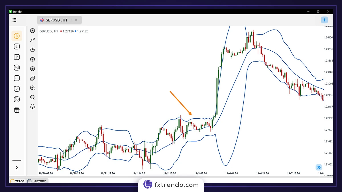 اندیکاتور باندهای بولینگر (Bollinger Bands)، یکی دیگر از ابزارهای معروف تحلیل تکنیکال است که توسط جان بولینگر توسعه یافته است. این اندیکاتور از یک خط میانی، که معمولاً یک میانگین متحرک ساده (SMA-20) است و دو خط دیگر باند بولینگر، انحراف معیاری از خط میانی هستند که در دو طرف آن و با فاصله قرار دارند. مانند سایر ابزارهای تحلیل تکنیکال، هر کسی میتواند طبق استراتژی و روش خاص خود از این ابزار استفاده کند، اما روش عمومی و مرسوم استفاده از اندیکاتور باندهای بولینگر، به این صورت است که معاملهگران منتظر ایجاد یک فشردگی در باندهای اندیکاتور میمانند و سپس سعی میکنند در جهت درست، حرکت بعدی مارکت را معامله کنند. زیرا در اغلب مواقعی که باند بولینگر فشرده میشود، مارکت بعد از آن، یک حرکت شارپ و اسپایک را آغاز میکند. در تصویر زیر یک نمونه از فشردگی یا انقباض باندهای بولینگر را مشاهد میکنید که بعد از آن یک حرکت صعودی و شارپ توسط مارکت آغاز شده است:
