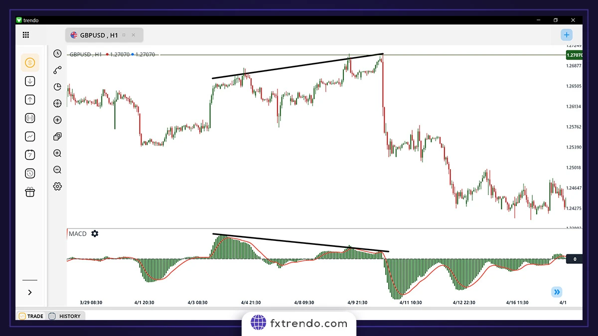 در تصویر زیر یک مثال از واگرای مکدی در نماد GBPUSD را مشاهده میکنید که قیمت بعد از آن، یک حرکت نزولی پرقدرت را شروع کرده است: