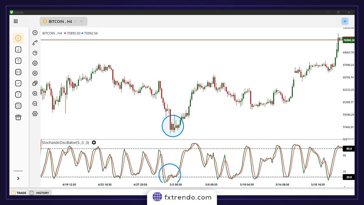 استوکاستیک نیز مانند اندیکاتور RSI دارای تو دو ناحیۀ اشباع خرید و اشباع فروش است. در واقع هرگاه پارامترهای %K و %D به بالای محدودۀ ۸۰ برسند، معاملهگران آن را اشباع خرید در نظر میگیرند و با ایجاد سایر تأییدیهها، وارد معاملۀ فروش میشوند و از طرفی هرگاه پارامترهای %K و %D وارد حالت اشباع فروش (زیر ۲۰) شوند، معاملهگران بهدنبال معاملات خرید خواهند بود. همانطور که در تصویر زیر مشاهده میکنید، پس از ورود اندیکاتور استوکاستیک به ناحیۀ اشباع فروش، مارکت حرکت صعودی خود را آغاز کرده است: