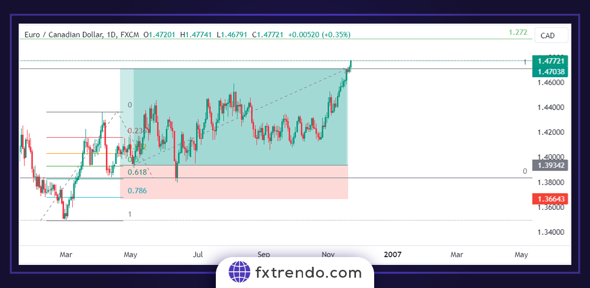 Ensuite, nous utilisons « l’extension de Fibonacci ou trois points » au lieu du retracement de Fibonacci pour déterminer le profit ou les points cibles. Pour dessiner une extension de Fibonacci sur le graphique, cliquez d’abord sur le plus bas précédent, puis faites glisser et cliquez sur le plus haut récent. Enfin, faites glisser le curseur jusqu’au dernier étage. Le graphique ci-dessous montre comment les extensions de Fibonacci sont tracées en utilisant les swings les plus bas et les swings les plus hauts.