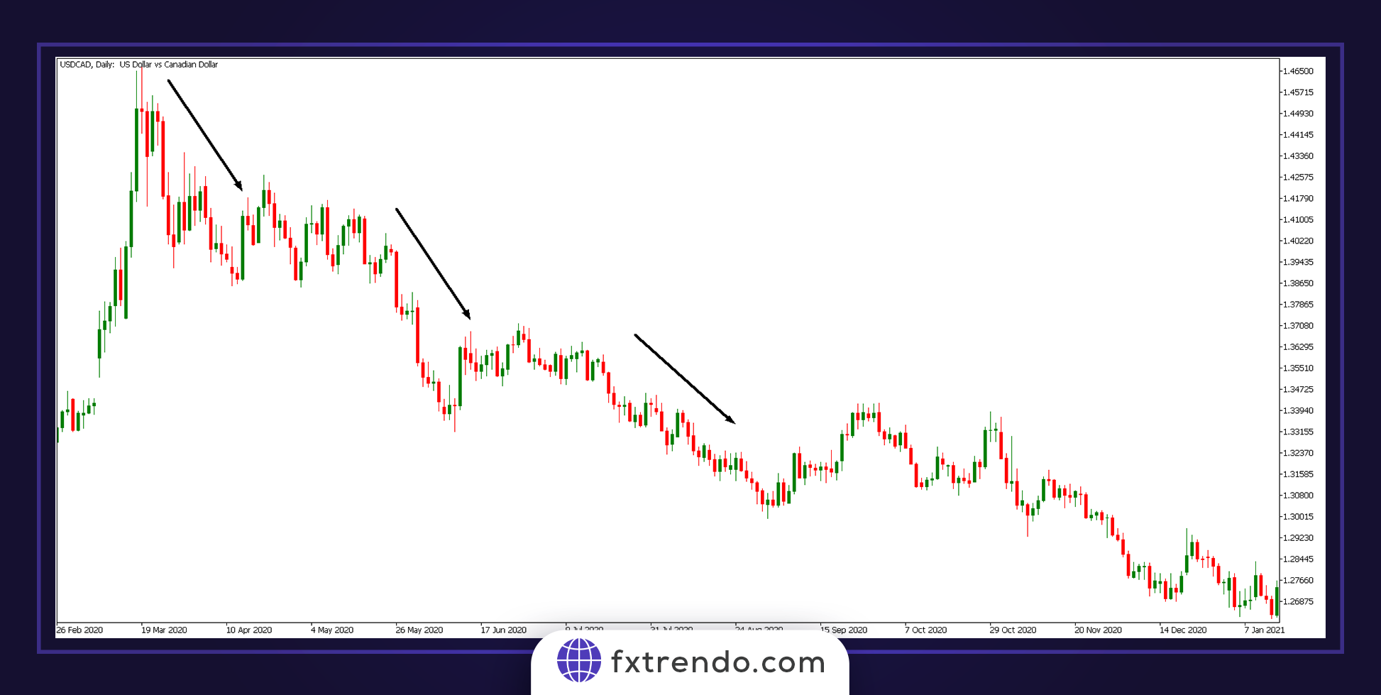 La première et la plus importante étape du trading consiste à déterminer la tendance et la structure du marché . Tout d’abord, déterminez quelle est la tendance du marché. Haussier, baissier ou en range ! Négociez uniquement dans le sens de la tendance. Par exemple, si vous êtes dans une tendance haussière, utilisez uniquement des ordres bloqués qui jouent un rôle de soutien. Par exemple, dans l’image ci-dessous, nous constatons une tendance baissière sur la période quotidienne de la paire de devises USDCAD. Le prix tient compte des étages inférieurs et des plafonds.