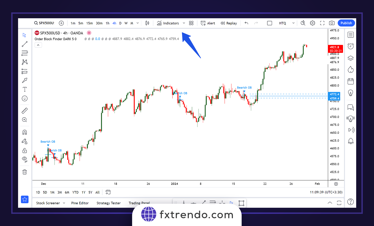 Au début, il peut être un peu difficile pour vous d’identifier les bons ordres bloqués. Une autre façon de trouver les ordres bloqués consiste à utiliser un indicateur. Pour ce faire, connectez-vous d’abord à la « plateforme Trading View ». Dans la section Indicateurs, recherchez « Order Block Finder ». Il existe plusieurs indicateurs que vous pouvez utiliser, cliquez sur l’option souhaitée et l’indicateur souhaité sera ajouté à votre graphique. Ces indicateurs identifient les ordres bloqués sur différentes délai et vous pouvez les utiliser pour planifier des domaines importants.