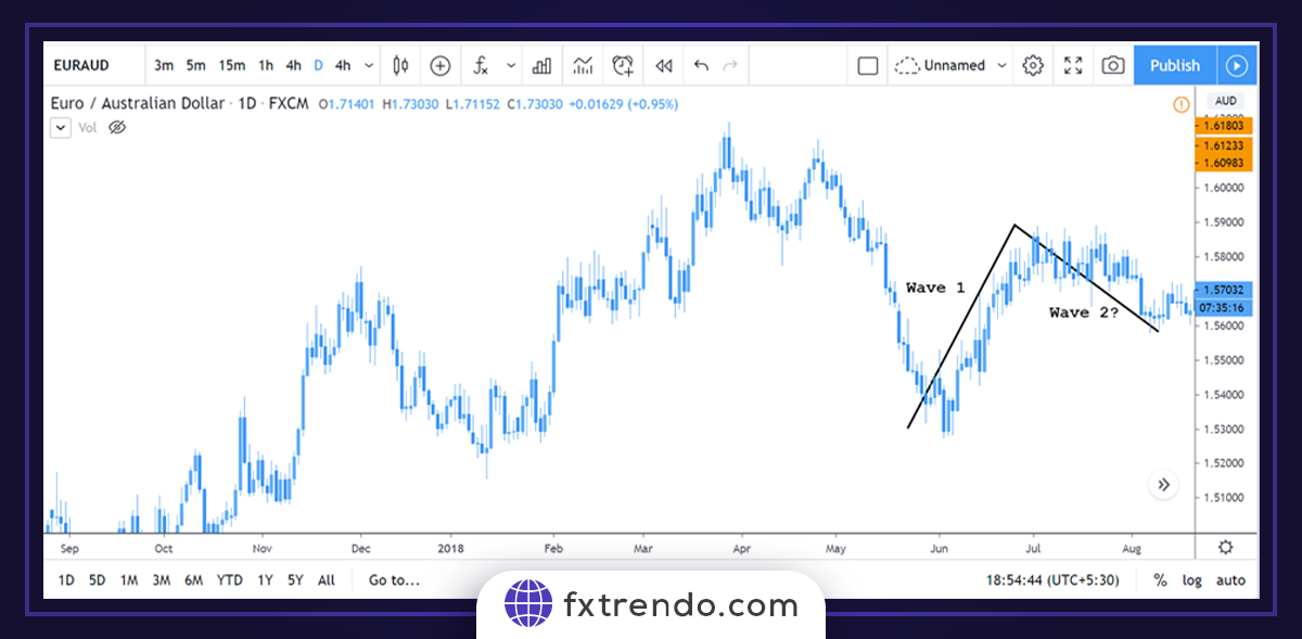 La stratégie consiste à échanger des vagues d’impulsion. Dans le modèle d’impulsion à 5 vagues, trois vagues sont avec la tendance et deux contre. Parmi ces trois vagues impulsives, la vague idéale à capter est la vague numéro 3. Comme cette vague est généralement la plus forte parmi les trois vagues impulsionnelles, elle réduit considérablement le risque du trade. Dans l’exemple ci-dessous, le prix commence à se corriger après que le marché ait fait la première vague. Mais nous ne savons pas où s’arrêtera la correction du marché et achèvera sa deuxième vague. Par conséquent, nous utilisons d’autres outils pour déterminer l’ampleur de la correction du marché. Considérez le tableau des prix ci-dessous. Comme nous l’avons vu, le marché a connu sa première vague. Ensuite, la deuxième vague a commencé, au cours de laquelle le marché a commencé à se corriger. Cependant, notez qu’à ce stade, nous ne pouvons pas déterminer la fin de la vague 2. Par conséquent, pour déterminer l’achèvement de la vague 2, nous devons utiliser le retracement de Fibonacci.