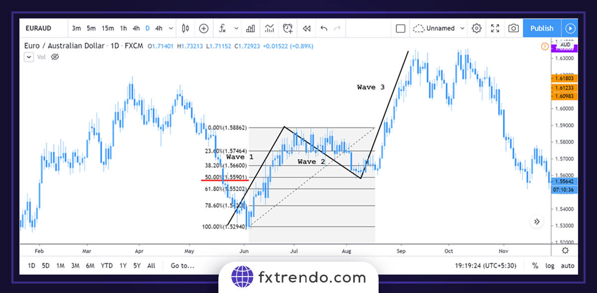 Dans le graphique ci-dessous, le retracement de Fibonacci est utilisé et nous pouvons voir que le mouvement baissier du marché s’arrête au niveau de 50 %. Il est donc confirmé que la vague 2 est terminée. Nous pouvons donc nous préparer aux prévisions de la troisième vague.