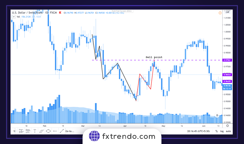 Dans cette stratégie, nous considérons le modèle complet de 3 à 5 vagues. Le modèle d’impulsion à 5 vagues est représenté par des lignes de tendance noires, tandis que le modèle correctif à 3 vagues est représenté par des lignes de tendance rouges dans le graphique ci-dessous. Puisque dans les règles de modèle de vague d’Elliott, le haut de la troisième vague corrective doit être inférieur au bas de la première vague dans le modèle d’impulsion, nous pouvons entrer dans une transaction de vente dans la zone indiquée.